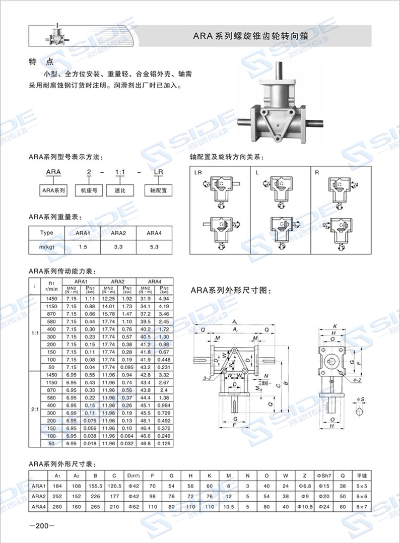 ARA轉向箱,標準化,多品種,速比1:1、1.5:1、2:1、3:1全部為實際傳動比。平均效率高達98%。