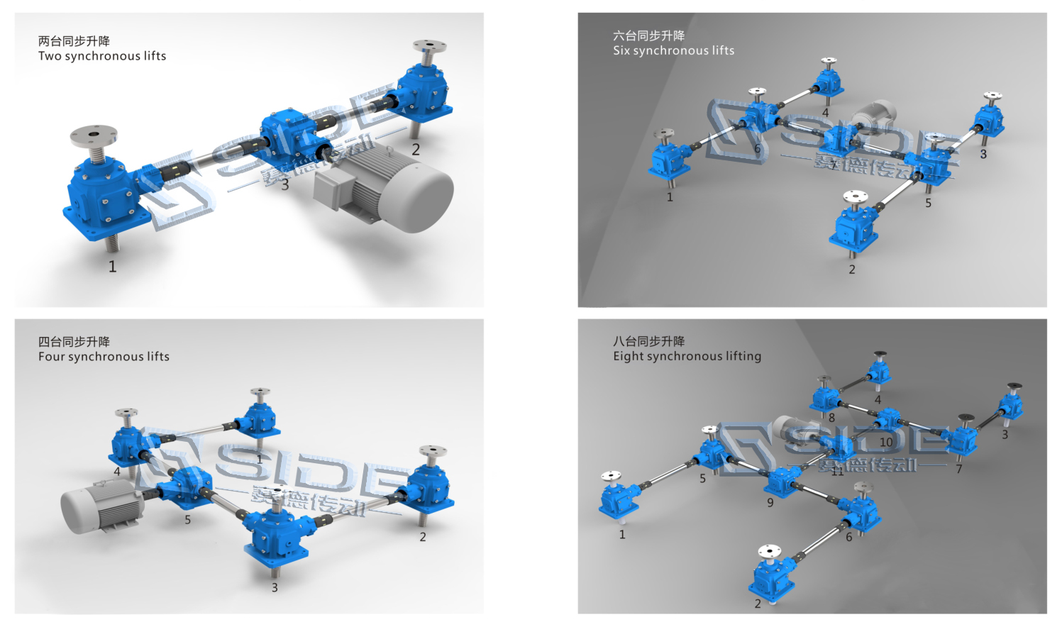 多臺同步升降由同步控制柜、液壓升降裝置和位移傳感器組成,其中對應每個升降點都有一套液壓升降裝置和位移傳感器。同步控制采用可編程控制器和變頻調速技術,實時檢測、計算各升降點的負載、位移和高差,自動調節變頻器的輸出,控制液壓升降裝置的運行速度,使各點的位移偏差始終處于設定范圍內,實現同步升降。同步升降臺適合大型構件升降施工,同步精度高,能在嚴重偏載和較大變載荷等工況下進行多點同步升降。